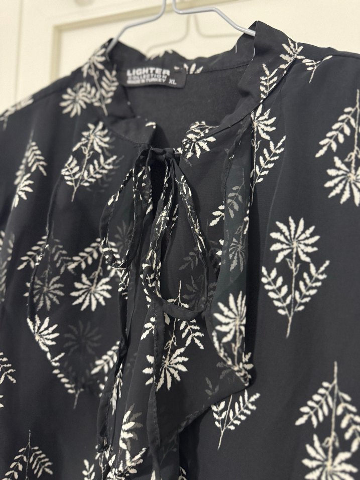 Siyah bohem midi elbise, bol kesim, uzun kollu ,omzu vatkalı ve V yakalıdır. Tie-dye desenli, fırfırlı ve yumuşak sentetik kumaştandır. Günlük kullanıma uygundur.