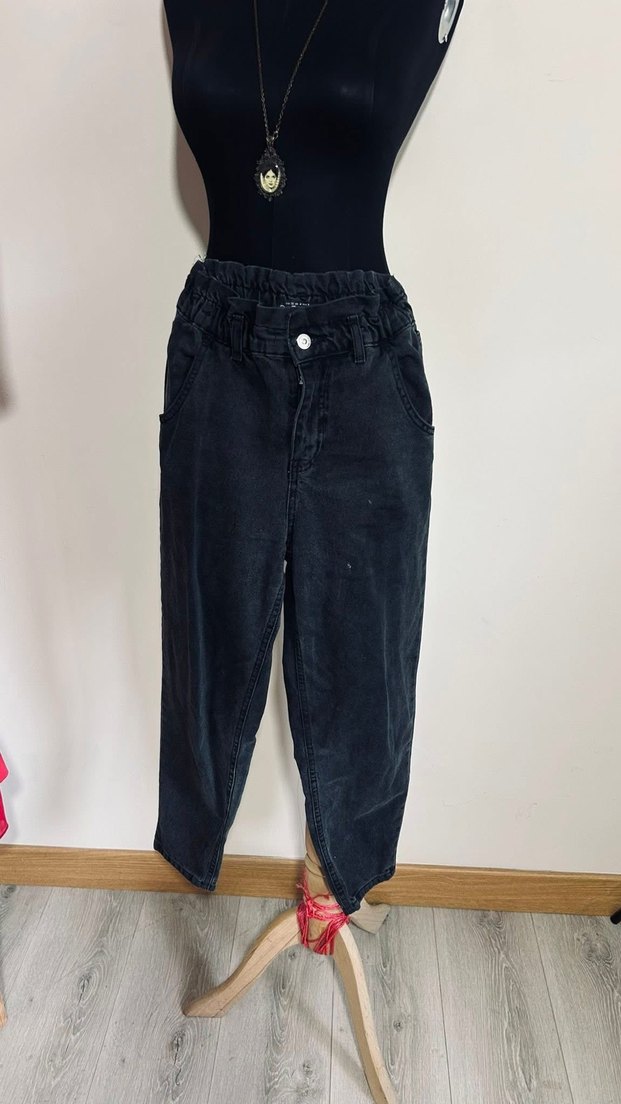 Kadınlar için kemerli, bol kesim siyah denim pantolon. Normal midi boyda, günlük sokak stiline uygun rahat tasarım. S-M beden uygun