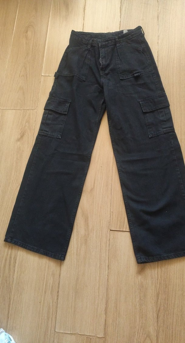 Siyah renkli, bol kesim ve kemerli kadın denim pantolon. Çoklu cepleri ve midi boyu ile günlük sokak stiline uygun.