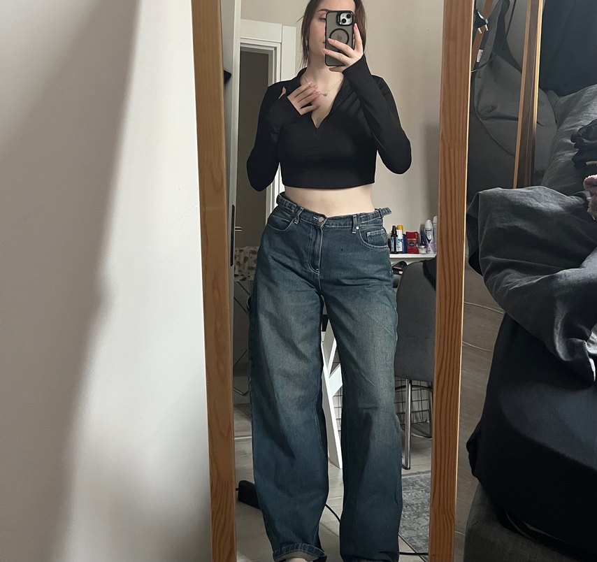 Kadınlar için siyah renkli, bol kesim ve midi boy kot pantolon. Desensiz ve rahat kesimiyle günlük sokak stiline uygundur.