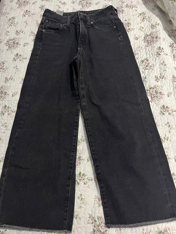 Siyah renkte, bol kesim ve midi boy kot pantolon, günlük rahat kullanım için uygundur.