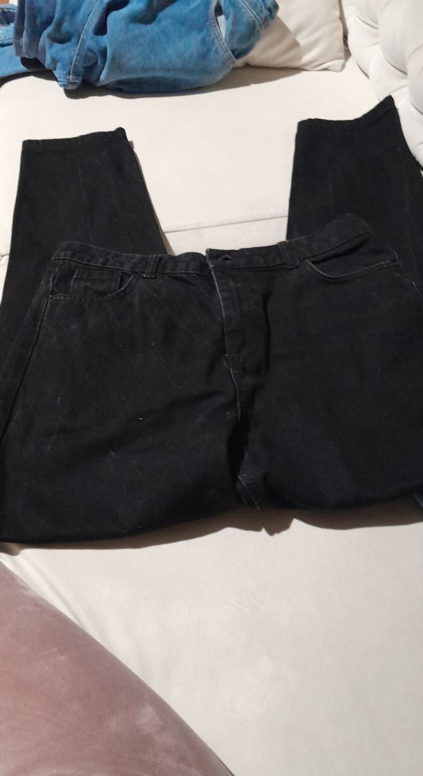 Kadın siyah renkli, bol kesim ve midi boy normal uzunlukta denim jean. Tokalı detaya sahip, desen içermeyen rahat günlük kullanıma uygun pantolon.