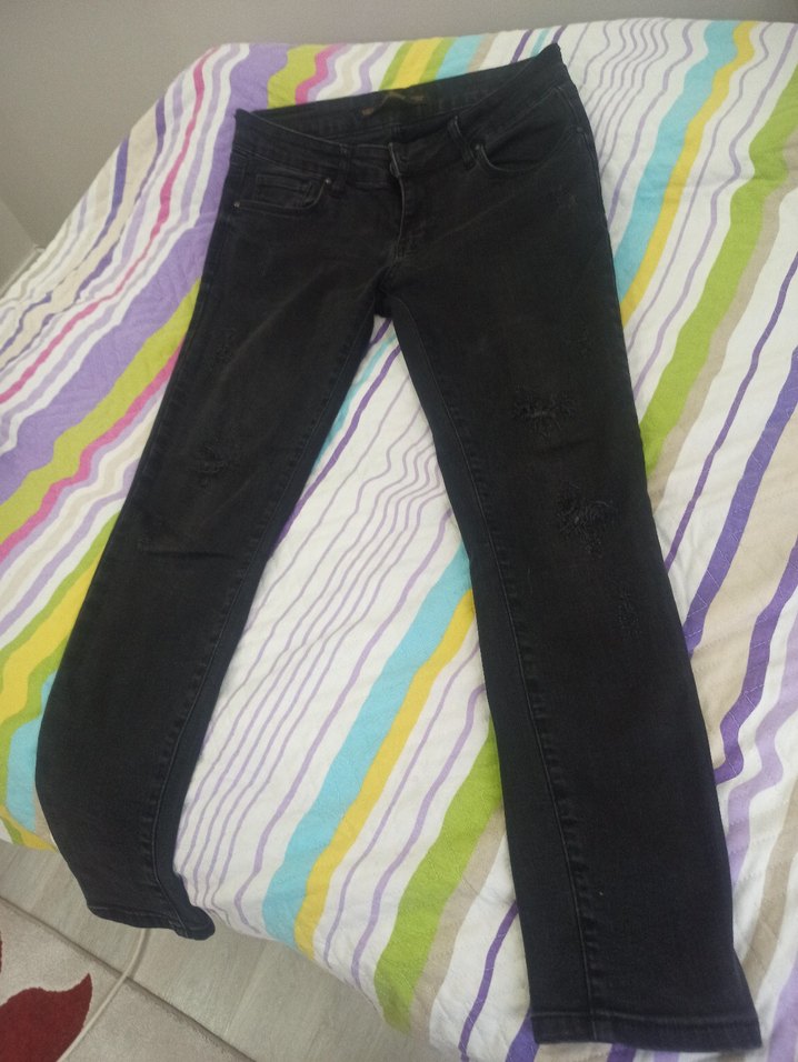 Siyah bol kesim, bağcıklı detaylı ve desenli midi uzunlukta denim pantolon, günlük kullanıma uygun.30 beden dar paca dusuk bel fume renkli kotu kumasi cok kaliteli