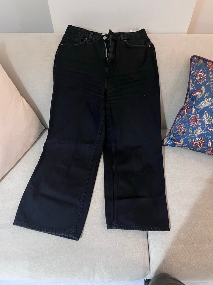 Bu siyah kot pantolon, bol kesim ve midi boydadır, kemer detaylıdır. Günlük sokak tarzı için uygundur.