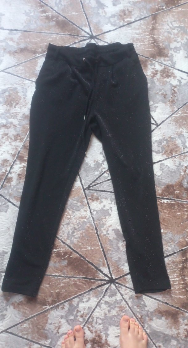Kadınlar için siyah, bol kesim midi uzunlukta kumaş pantolon. Tokalı detay içerir. Sentetik kumaştan, günlük sokak tarzı için uygundur.