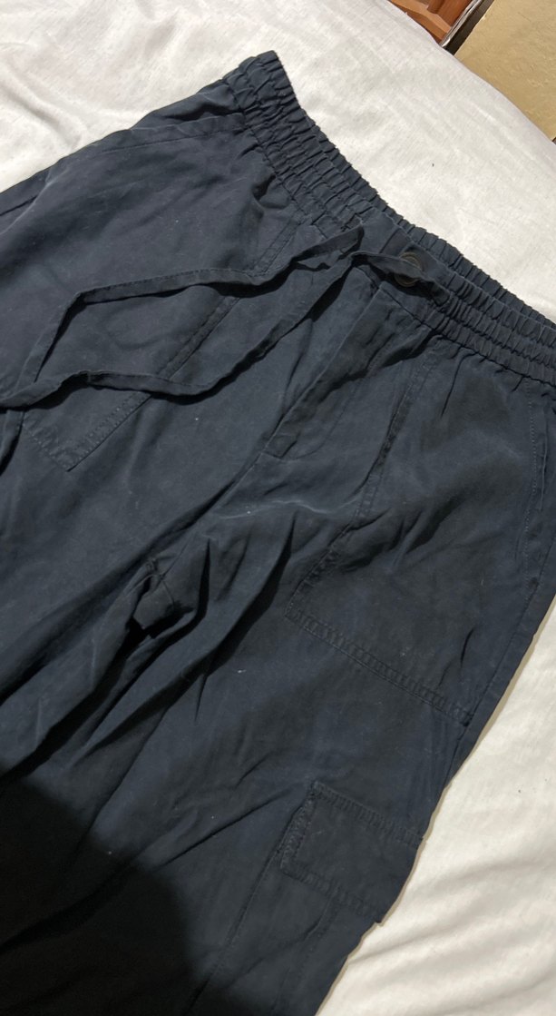 Kadınlar için siyah pantolon, bol kesim. Hiç giyilmemiş. Alındığı gibi duruyor. Rengi siyah ama soluk siyahlardan. Kara siyah değil. Yan cep-kargo cep bulunuyor. Düğme, fermuar ve ip bulunuyor. Belini istediğiniz gibi ayarlayabilirsiniz. Paçasında da lastik bulunuyor. Bol seven small beden de olur. Beli ayarlanabilir. (Sipariş kargolanmadan önce tüm ürünler yıkanıp gönderiliyor. Dolaba da yıkanıp kaldırılmıştır. Ütüsüzdür. )