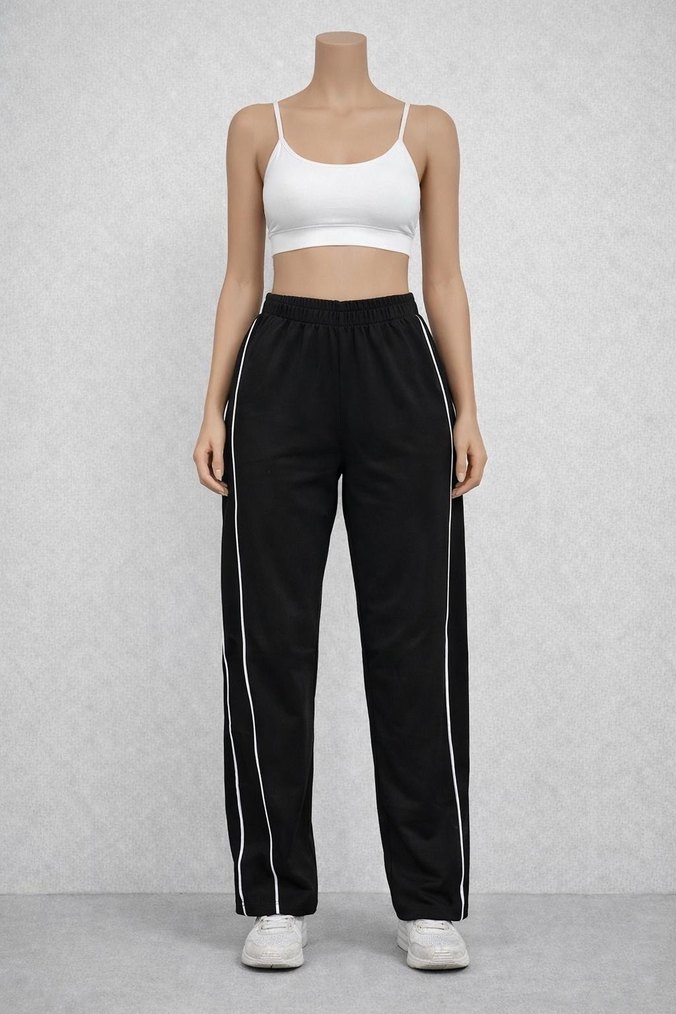 Kadınlar için bol kesim, normal boyda, yanları beyaz şerit detaylı siyah spor pantolon. Pürüzsüz sentetik kumaştan, rahat ve şık bir sokak stili sunar.