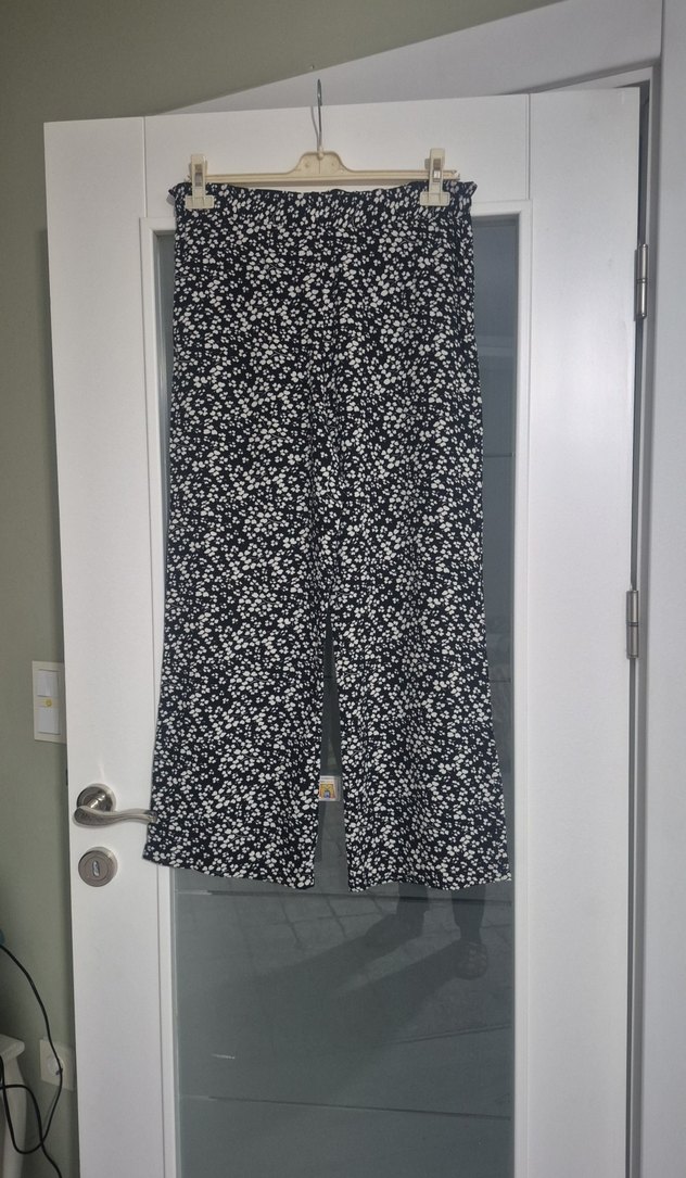 Kadınlar için uzun kesim, bol kesim ve siyah çiçek desenli rahat pantolon. Yumuşak kumaştan üretilmiştir, günlük dış mekan kullanımı için uygundur.