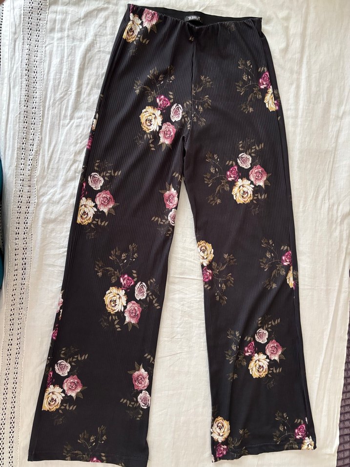 Kadınlar için siyah zemin üzerine koyu renk çiçek desenli, piliseli ve bol kesim midi boy bohem tarz pantolon. Günlük kullanım için uygundur.