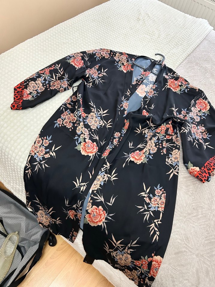 Sabahlık hiç kullanılmadı L beden Kadınlar için uzun, bol kesim, ipek dokulu siyah üzerine çiçek desenli olan sabahlık Uzun kollu ve yakası kesik, bohem tarzına uygun.