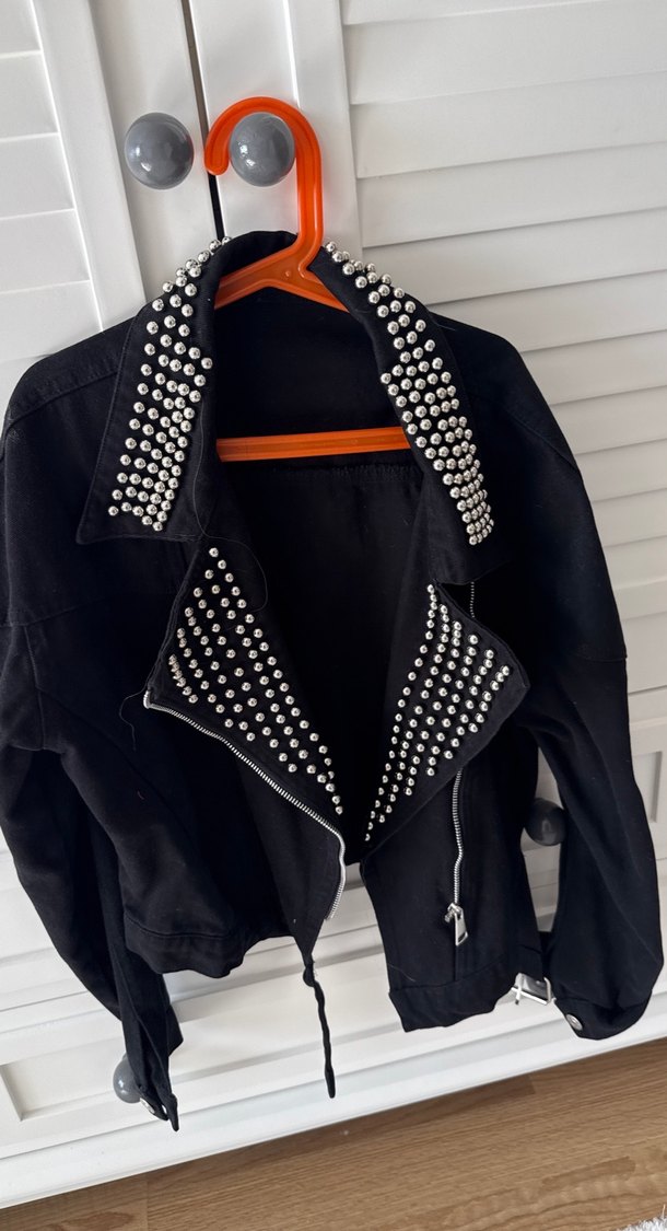Gümüş çivilerle süslenmiş, düğmeli, siyah denim ceket. Notlu yaka, strappy kollu, fitted ve midi boyda, fermuar detaylı.