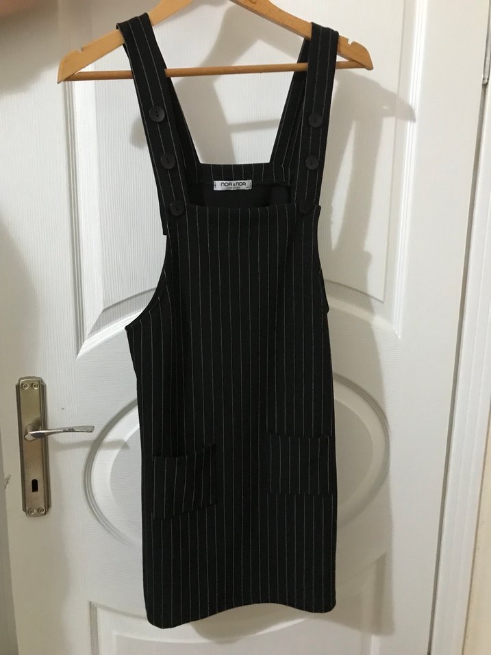 Siyah çizgili, askılı ve tokalı kısa tulum. Yumuşak sentetik kumaştan, yüksek yakalı ve vücuda oturan midi boyda. Sokak modasına uygun.