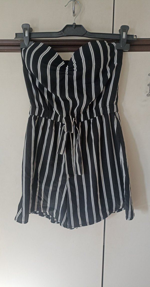 Siyah çizgili, straplez yaka ve beli kuşaklı, vücuda oturan midi tulum. Pürüzsüz sentetik kumaştan üretilmiştir, gündelik sokak stili için uygundur.kusursuz