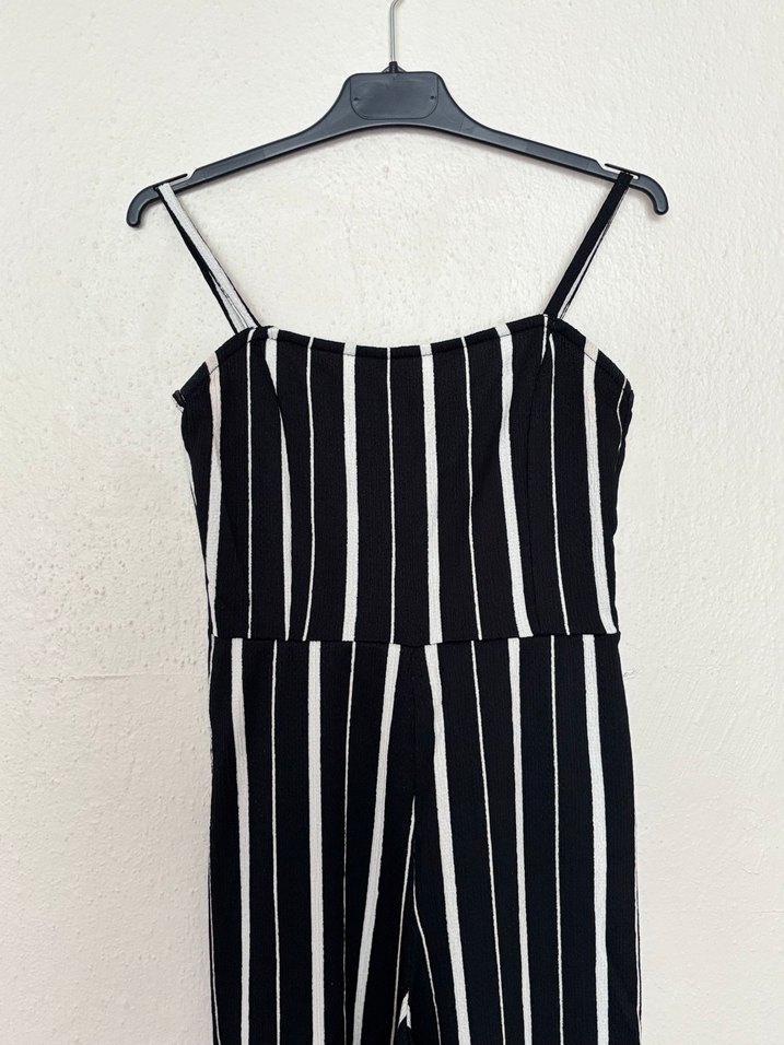 Kadın tulumu, ince askılar ve straplez yakayla siyah-beyaz dikey çizgilidir. Sentetik kumaştan, pileli ve vücuda oturan kesimdedir.