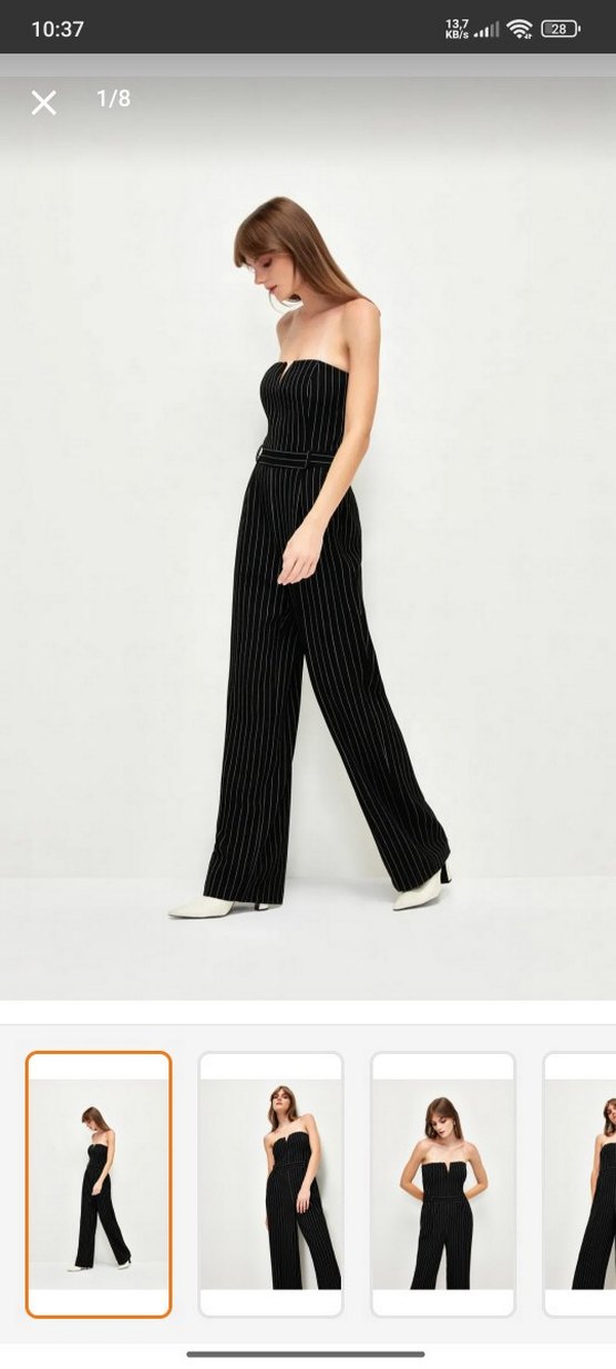 Kadın siyah çizgili, askısız ve ince askılı tulum. Belde kemer detayı, uzun paça ve regular fit kesimle ofis için uygun.1 kez Nişan'da giydim kumaşı kalın çok kaliteli kışlıktır
