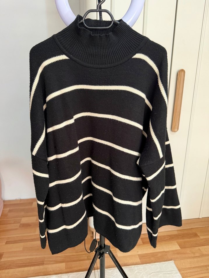 Kadınlar için siyah-beyaz çizgili, yün örme kumaştan yapılmış, bol kesim, uzun kollu ve balıkçı yakalı rahat triko kazak. Tiftiklenme mevcuttur.