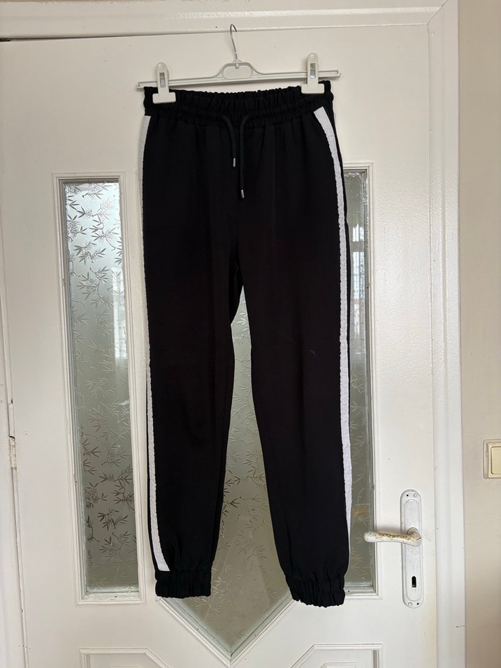 Kadın siyah eşofman, bol kesim ve normal midi boyda, beyaz yan çizgili. Beli bağcıklı ve yumuşak, sıcak kumaştan, spor ve gündelik kullanım için uygun.