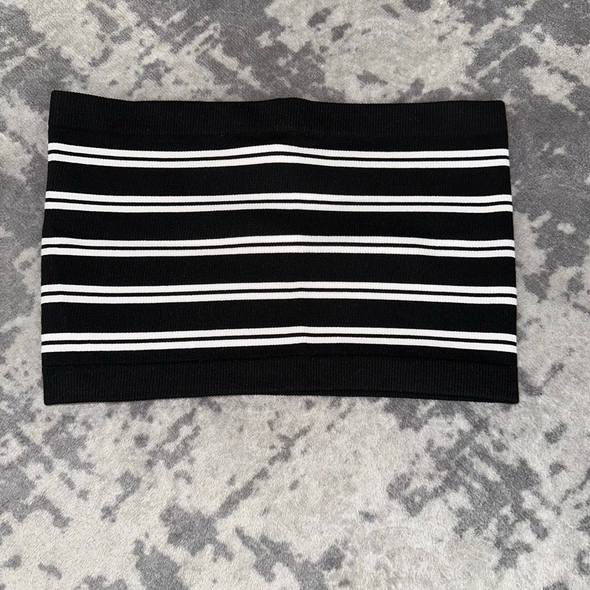 Kadınlar için elastik yapıda, siyah beyaz çizgili, yumuşak sentetik kumaştan yapılmış büstiyer. Rahat ve şık bir görünüm sunar