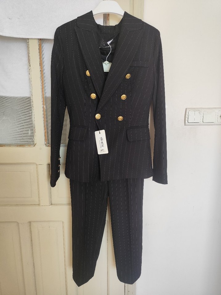 Kadın Siyah Çizgili Düğmeli Blazer Takım