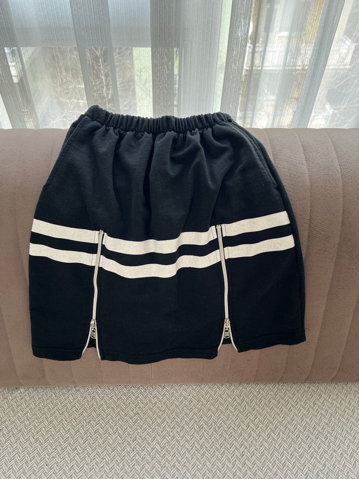 Siyah renkli, beyaz çizgili ve ön fermuarlı bol kesim mini etek. Sentetik kumaştan, günlük kullanım için uygun, sokak modası athleisure tarzında. Sorunsuz beden yazmıyor xs bedene olur çok tatlış bir etek