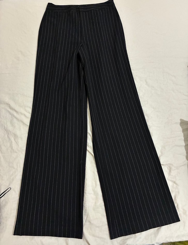 Kadın siyah kumaş pantolon, regular fit, pilili ve uzun boy. Çizgili deseniyle ofis ve sokak stiline uygun, klasik şıklık sunar.