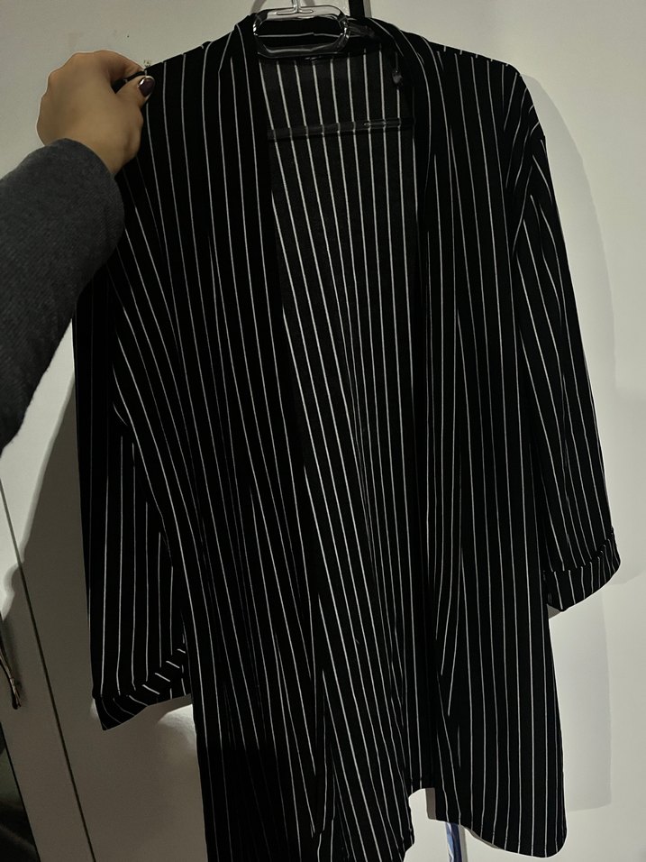 Siyah, çizgili, pilili midi blazer. Uzun kollu ve yaka detayı bulunan, sentetik kumaştan üretilmiş, düzenli kalıpta ofis kullanımına uygun.