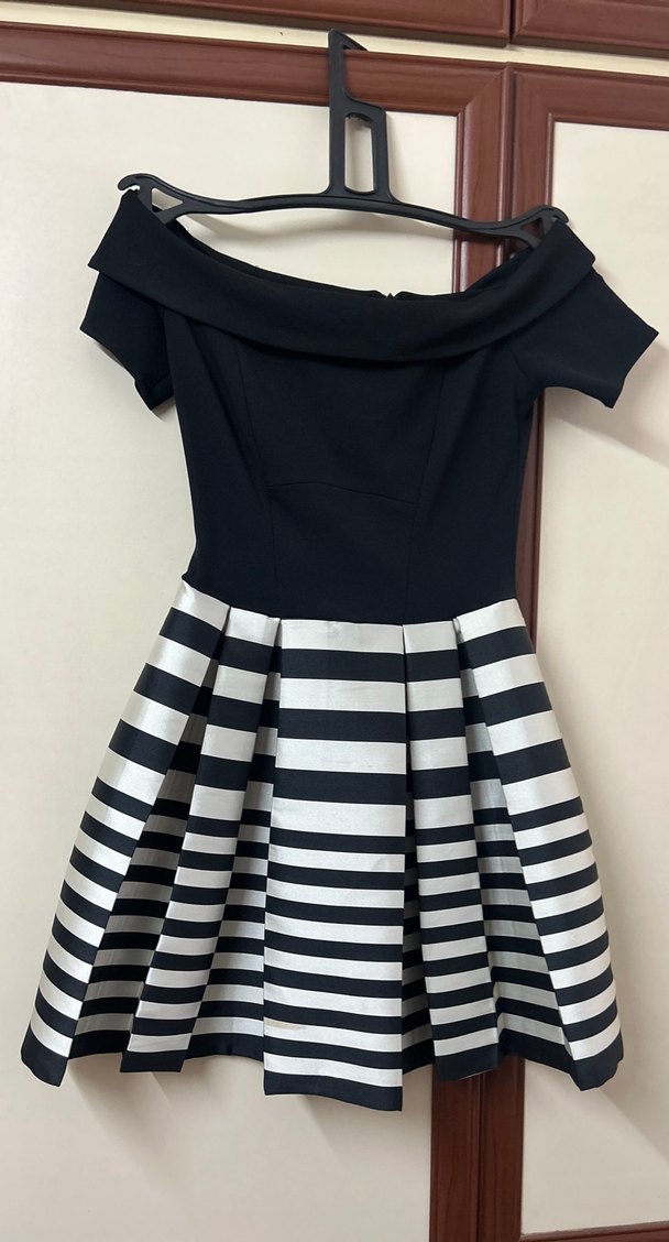 Tek omuz detaylı, oturan siyah gece elbisesi. Pilili midi etek kısmı siyah beyaz çizgili, parti için uygun şık tasarım.