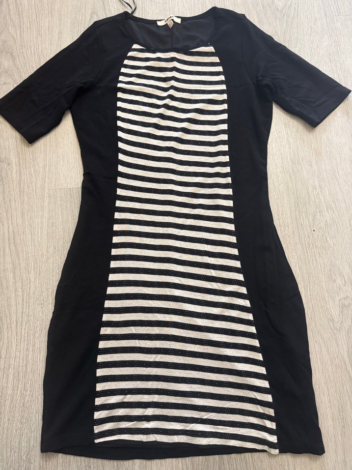 Dar kesim midi elbise, kısa kollu ve kayık yaka. Siyah yanlar ve pileli çizgili ön panel ile trend stili sunar. Günlük kullanıma uygun.