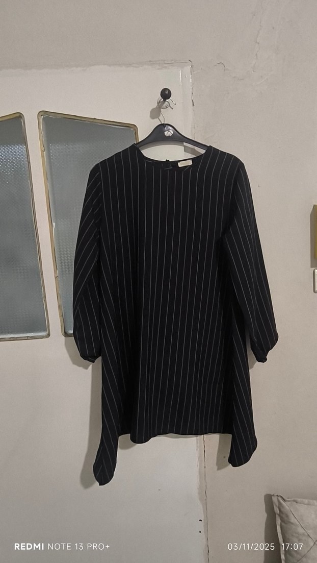 Uzun kollu, bisiklet yaka ve pile detaylı siyah midi keten tunik. Çizgili deseni ve rahat kesimiyle günlük şıklık sağlar. ✨ yenidir bir kere giyildi