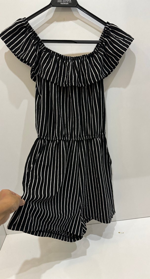 Kadınlar için dar kesim, tekne yaka, kısa kollu, pilili siyah çizgili midi tulum. Yumuşak sentetik kumaştan, günlük kullanıma uygun.