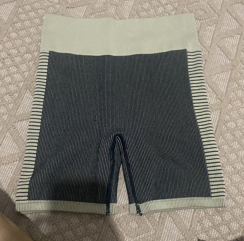 Siyah çizgili, elastik bel bantlı, vücuda oturan mini tayt. Sentetik kumaştan, spor ve sokak tarzı için uygun.