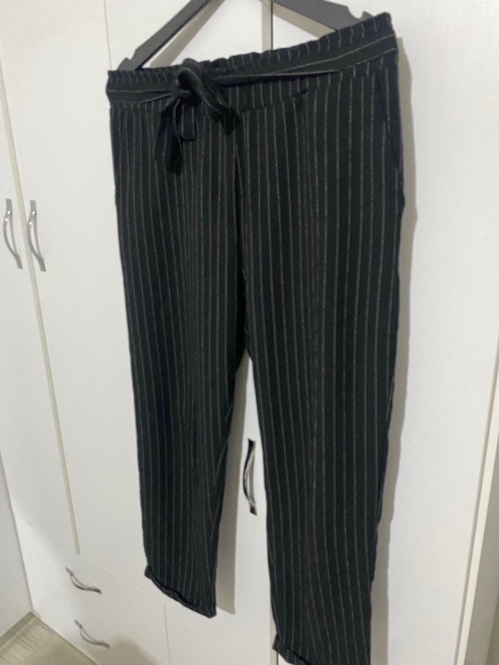 Kadınlar için yıka giy çık kumaştan, belden kemerli, çizgili desenli, rahat kesim midi uzunlukta pantolon. Ofis için uygundur günlük de kullanıma gayet uygundur kusuru yok