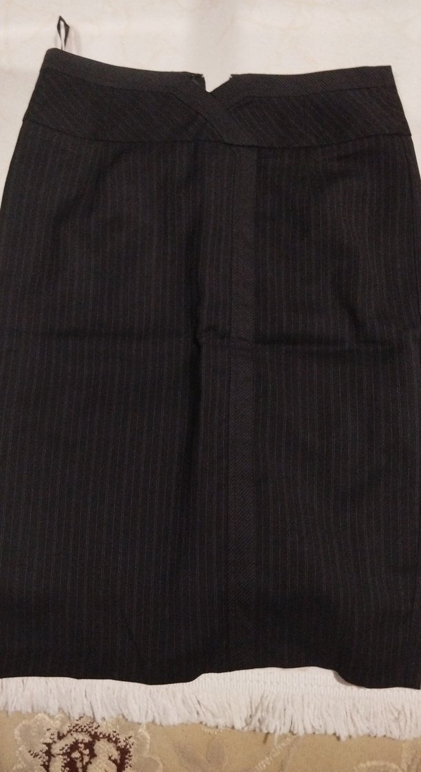 Siyah çizgili, pilili ve dar kesim kadın kalem etek, zaten kalitesinde kumaştan üretilmiştir, ofis kullanımı için uygundur.