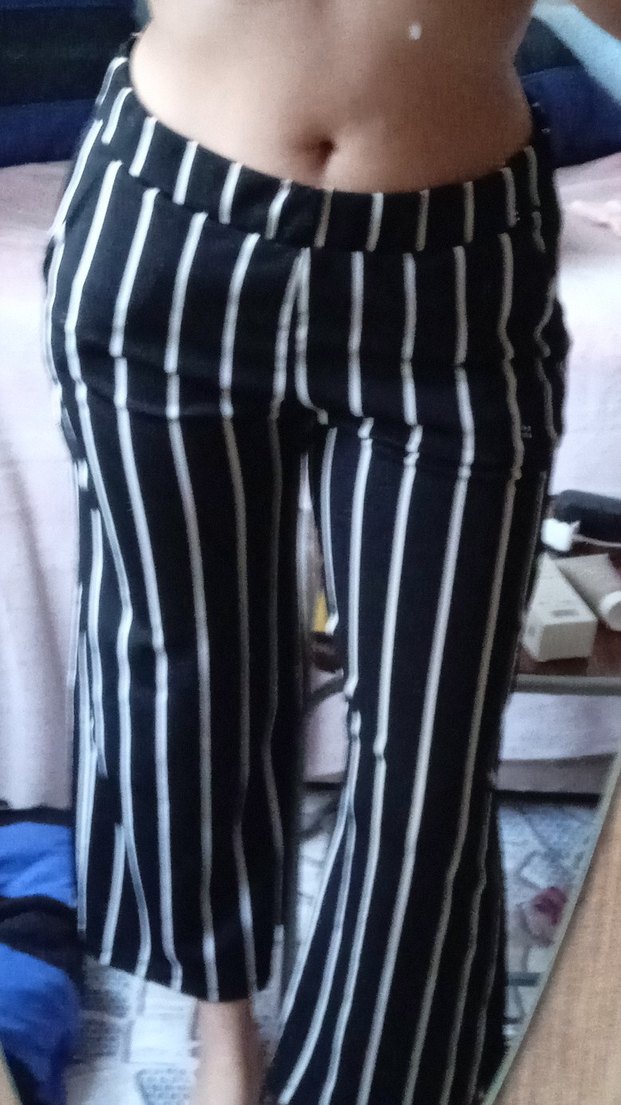 Dikey beyaz çizgili siyah kumaş, pilili ve vücuda oturan midi uzunlukta kadın pantolonu. Günlük rahat sokak stili için uygundur.