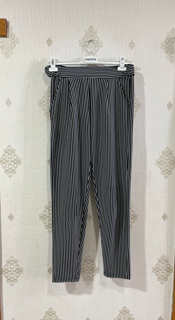 Kadınlar için siyah ve gri çizgili, pilili, normal kesim midi uzunlukta kumaş pantolon. Ofis ve sokak stiline uygun, Paris tarzı şık ve rahat. Yumuşak sentetik kumaştan.