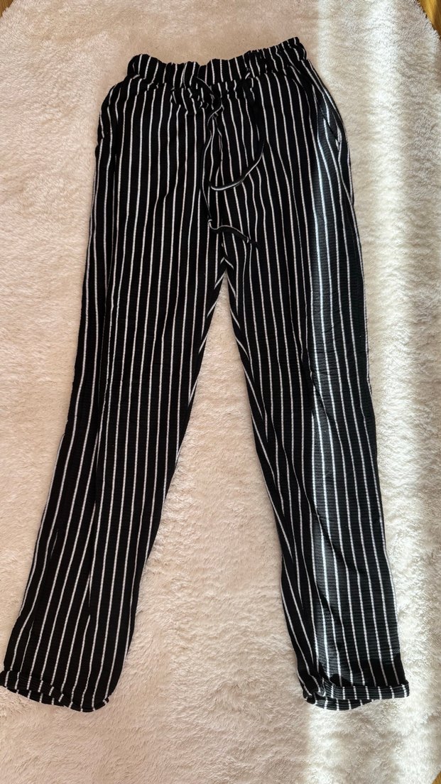 Kadınlar için siyah, beyaz çizgili, pilili ve regular fit kumaş pantolon. Sentetik kumaştan, günlük rahat kullanım için uygundur.