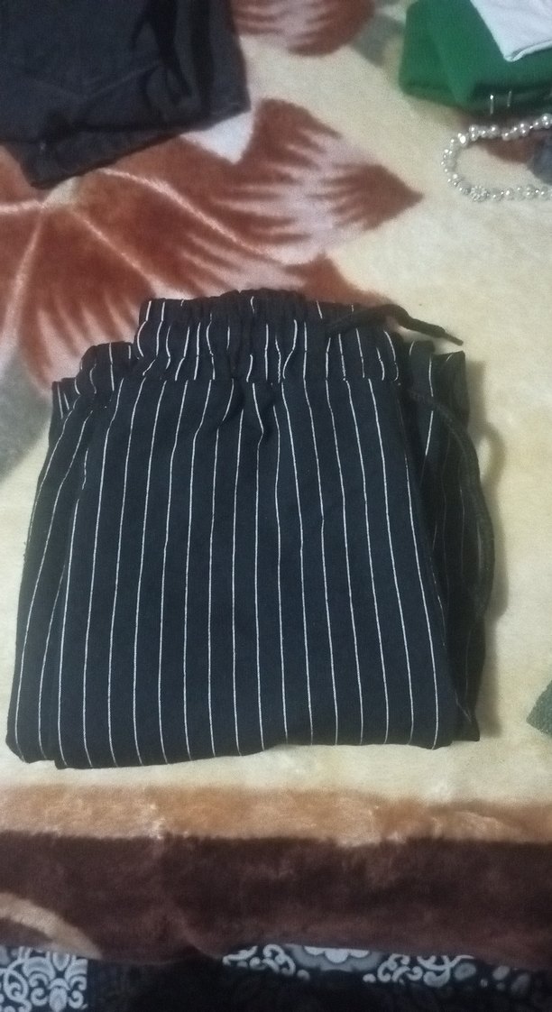 Kadınlar için siyah, çizgili ve pilili midi boy pantolon. Sentetik kumaştan, bol kesim ve günlük rahatlık için uygundur.