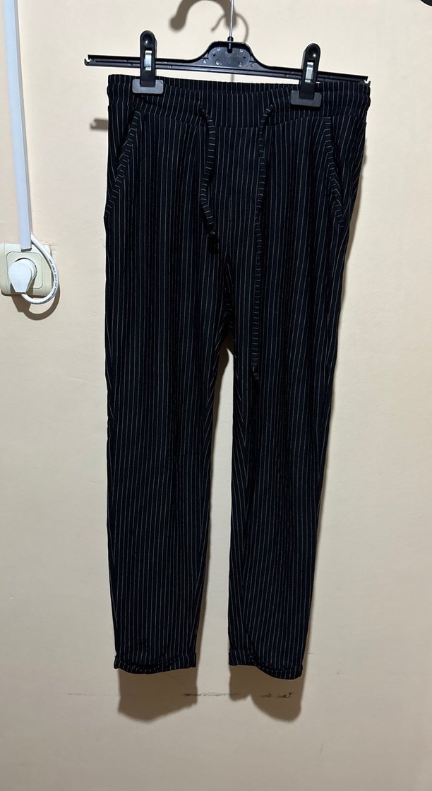 Siyah çizgili, pliseli kumaş pantolon. Rahat kesim ve midi boy, yumuşak sentetik kumaştan, günlük kullanıma uygun. Boy 90 cm bel 35 cm lastikli s beden