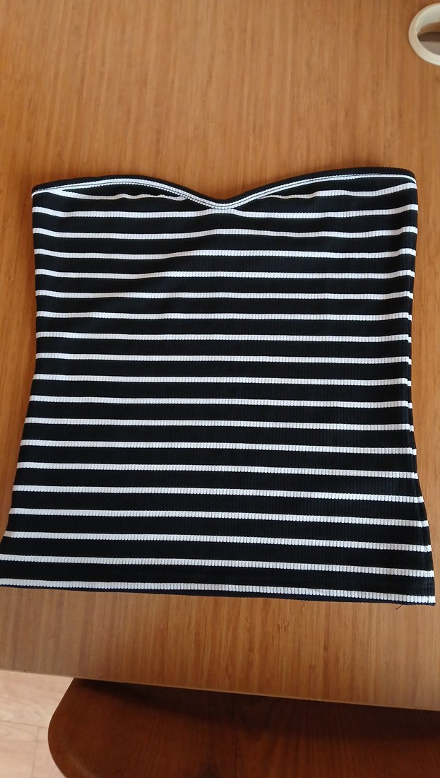 Kadınlar için siyah beyaz çizgili, straplez ve tekne yakalı, sentetik kumaştan yapılmış, pileli dokulu, midi boyda, dar kesim bustiyer. Günlük kullanıma uygundur.