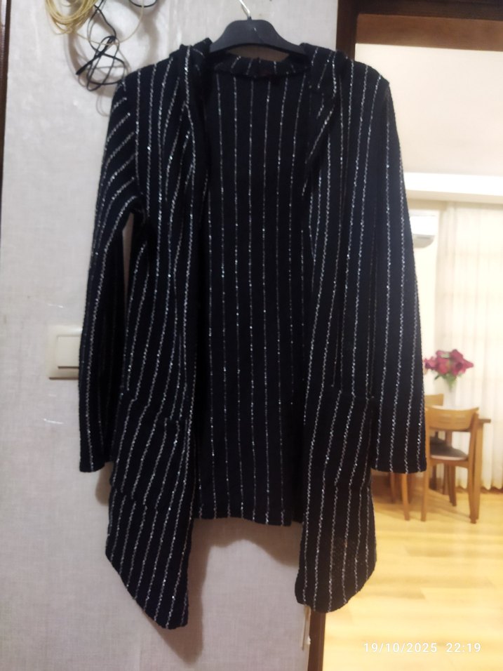 Siyah çizgili, pileli tasarımlı uzun kadın ceket, notalı yaka ve uzun kollu, rahat kesimle günlük sokak stili sunar.