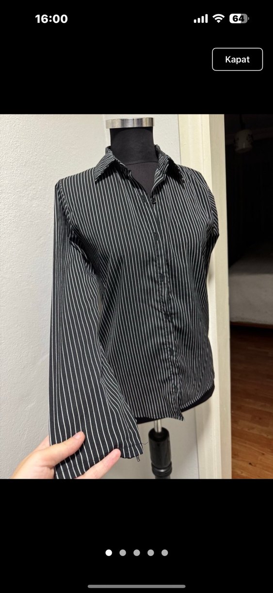 Siyah renkli, uzun kollu, yakalı ve düğmeli bu gömlek, çizgili desene sahip. Normal kesim ve midi uzunlukta, ofis ve günlük kullanıma uygun.
