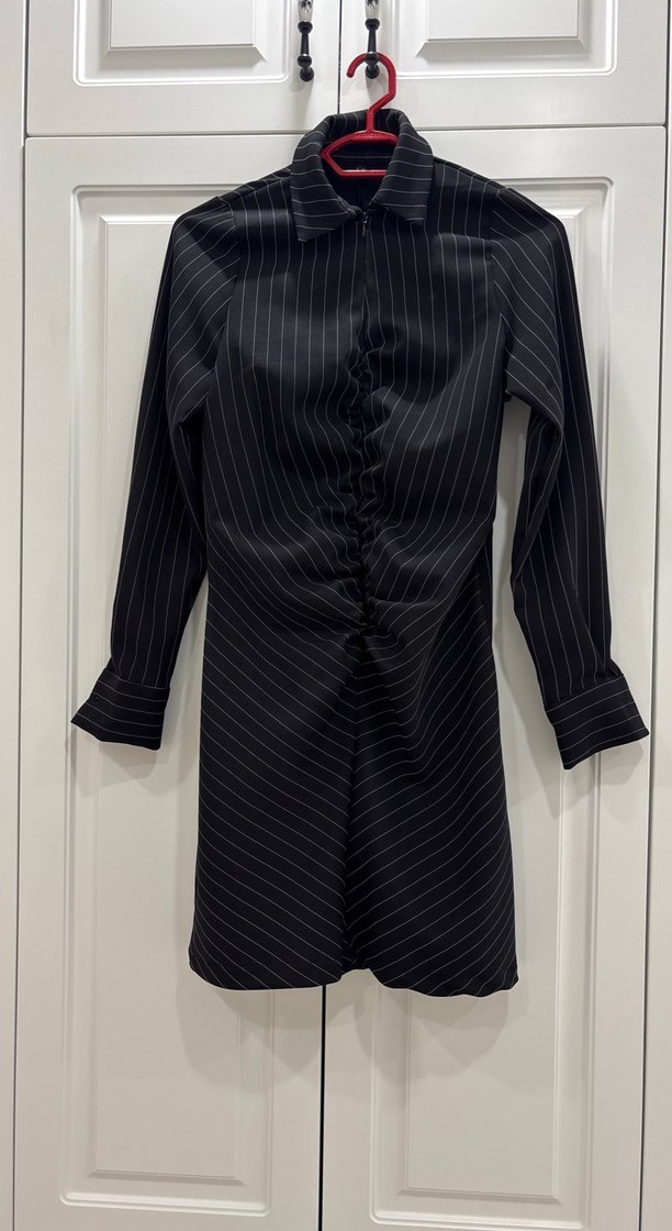 Kadın siyah çizgili takım elbise, pileli detaylı, kesik yaka ve uzun kolludur. Sentetik kumaştan üretilmiş, ofis için uygun, gotik tarzda ve düzenli kesimdir.