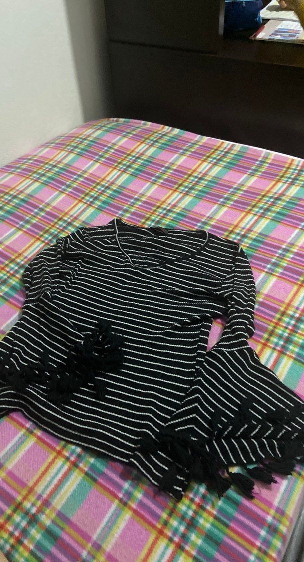 Siyah, uzun kollu, V yakalı, triko dokulu ve kolları püsküllü kadın bluzu, günlük kullanım için uygundur.