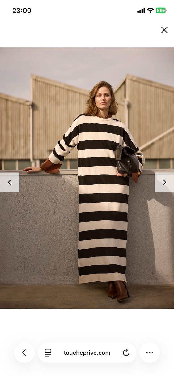 Uzun siyah çizgili triko elbise, bol kesim, uzun kollu ve tekne yaka detaylıdır. Drapeli tasarımı ve sentetik kumaşıyla sokak stiline uygundur.