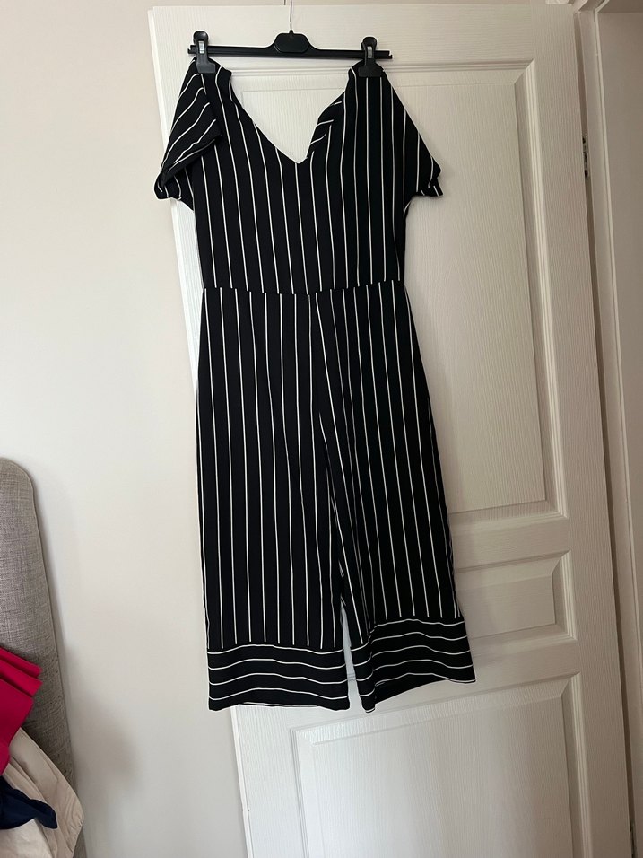 Siyah uzun tulum, kısa kollu, V yakalı ve pileli detaylıdır. Çizgili desene sahip, sentetik kumaştan yapılmıştır ve günlük sokak modası için uygundur.