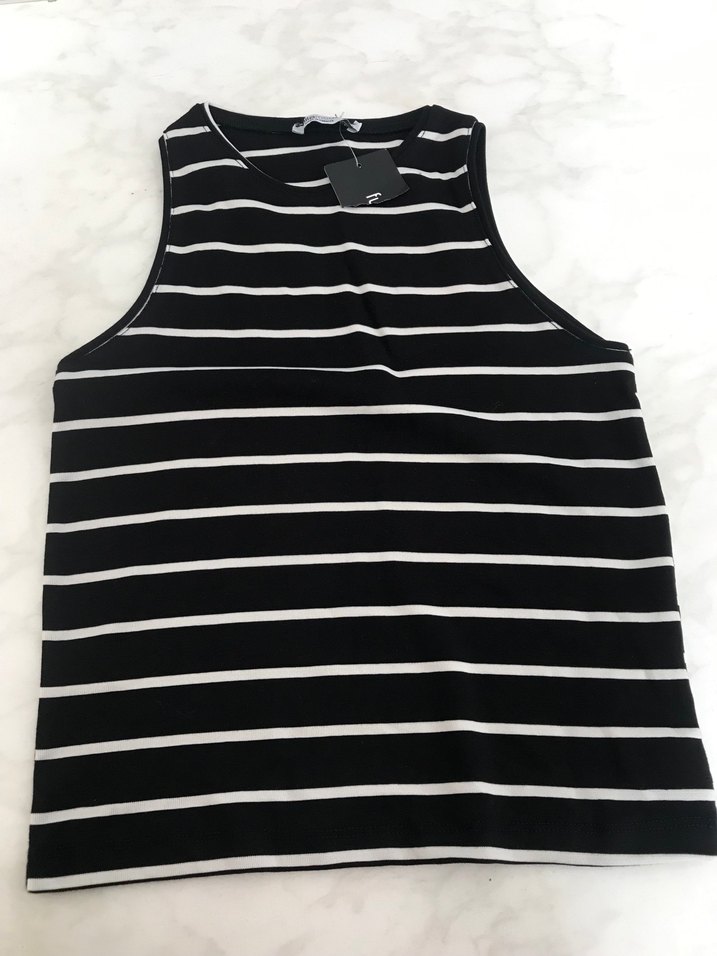 Siyah renkte, yüksek yakalı ve çizgili desenli, kolsuz kadın atlet. Sentetik kumaştan üretilmiş, vücuda oturan kesime sahip, günlük kullanım için uygun.