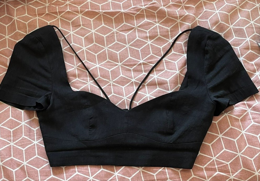 Zara marka siyah crop. Sırt kısmında ip detayları mevcut. Sırt kısmı kopçalı. Yarım kollu kalp yaka. XS beden.