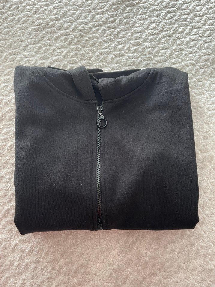 Siyah renkli, fermuarlı, kapşonlu ve uzun kollu kadın sweatshirtü crop formdadır. Yaka kısmında çok az bir sökülme var fotoğraflarda belirtilmiştir.