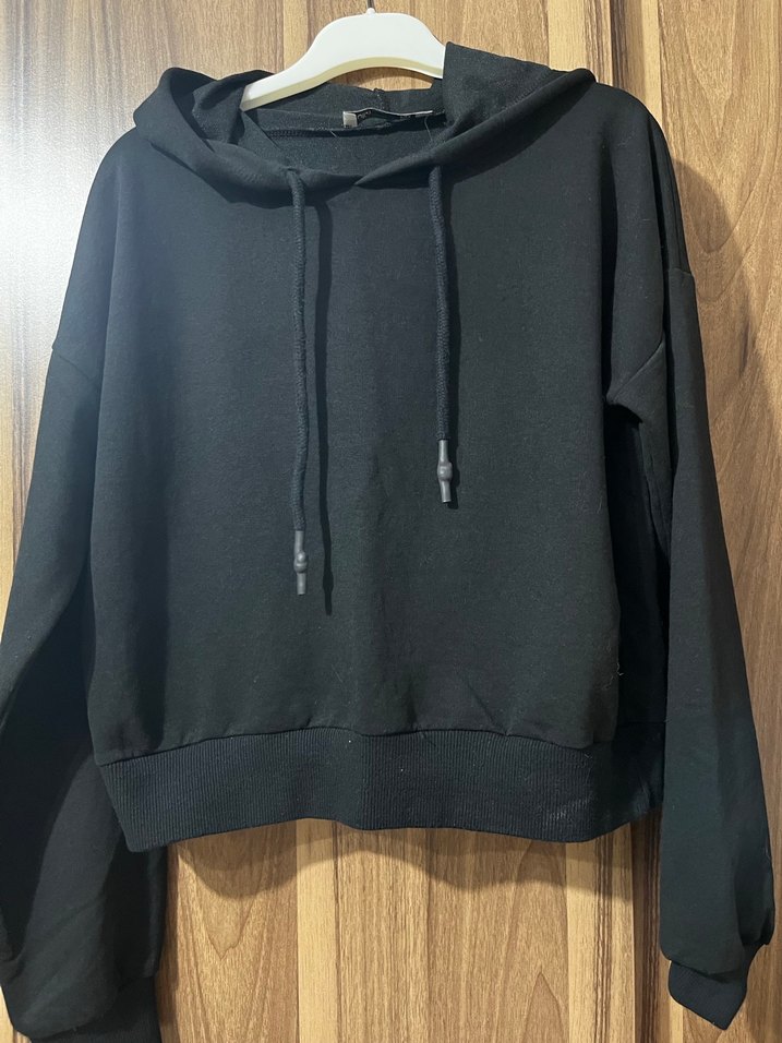 Kadınlar için uzun kollu, kapüşonlu ve rahat kesimli siyah crop sweatshirt. Yumuşak ve sıcak kumaştan, günlük sokak stiline uygun.