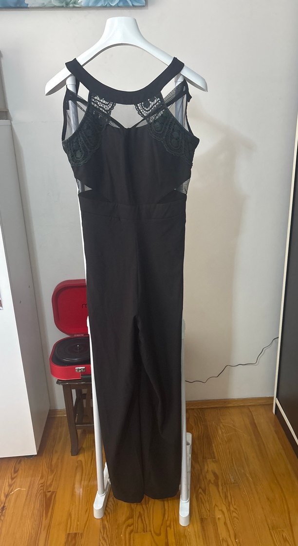 Dantel detaylı, askılı kolsuz uzun siyah tulum, sentetik kumaştan, gotik tarzda ve parti için uygundur.